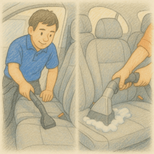 まず車内全体を掃除機で徹底的に吸い取り、毛やホコリを除去。